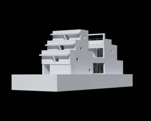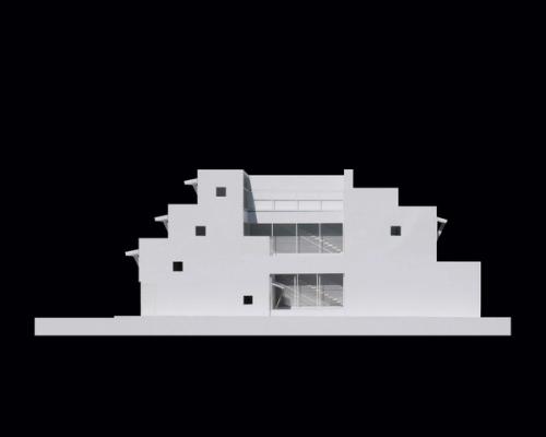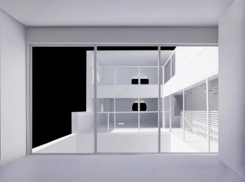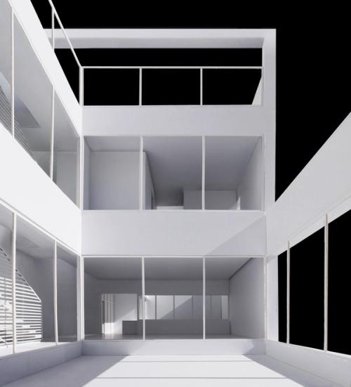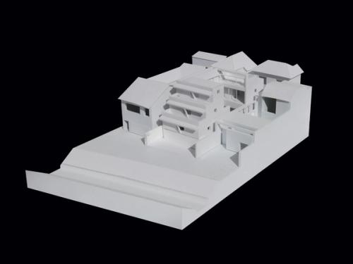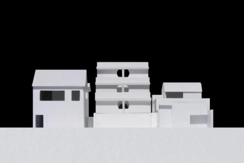 The terraced façade of the Canal House references Shitomodo eave styles, traditionally found in houses along canals, which provide privacy and orient views to the landscape and water. While historical Shitomodo eaves consist of a wooden panel lightly supported by a bamboo pole, in the Canal House, the eaves and struts are cast from concrete; an unexpected inversion of heavy and light elements as a contemporary expression of traditional construction. Under each eave, a single Yoshino-style window acts as a lantern below the overhangs.