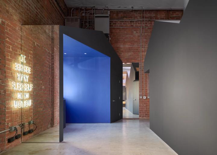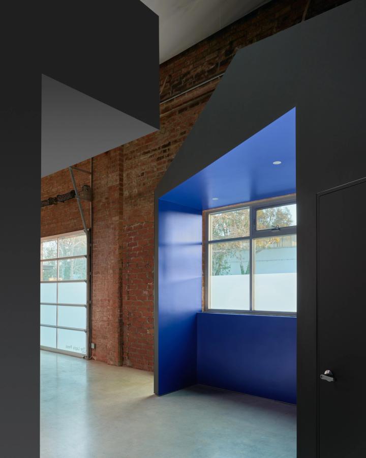 The facilities of The Lapis Press, a publisher of limited fine art editions, are located inside a former warehouse in Culver City and include spaces for large-scale printing, editing, as well as offices and a library. Large format production work occurs within the raw double height space, while quiet and concentrated activities such as editing and meetings take place inside the small volumes that are dispersed throughout the space.